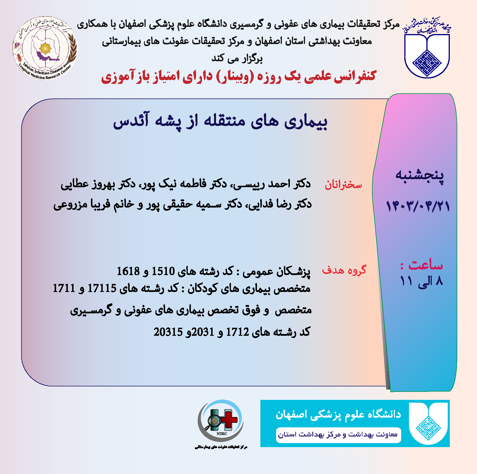 مرکز تحقیقات بیماری های عفونی و گرمسیری با همکاری معاونت بهداشتی استان اصفهان و مرکز تحقیقات عفونت های بیمارستانی برگزار می کند:وبینار یک روزه " بیماری های منتقله از پشه آئدس" دارای امتیاز بازآموزی